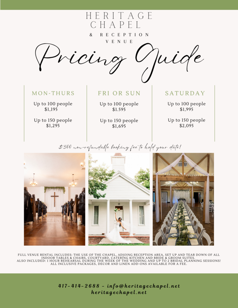- Rehearsal Option: Add hours the day before your ceremony for the Rehearsal, Rehearsal Dinner or Decorating! Additional fees apply.